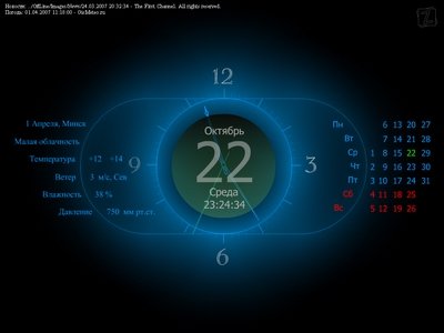 Yevgend Clock - Имеет большое количество настроек. Поддерживаются стили оформления часов, обои, музыка. При наличии соединения с интернет, выводит на экран пользователя и постоянно обновляет прогноз погоды для выбранного города от GISMeteo.ru, а также заголовки самых последних новостей и иллюстрации к ним на выбор: от Первого канала, НТВ, Яндекс и BBC. Для экономии трафика в корпоративной, домашней или многоквартирной сети возможно использование одного из компьютеров в качестве сервера для всех остальных компьютеров сети. Часы могут также отбивать время как обычные настенные ходики и выводить на экран поздравления или напоминания. Лицензия: FREEWARE! Язык: Русский Версия: 2.2 Размер: 3.72 Mb Операционная система: 98/ME/NT/2K/XP Скачать с LetitBit