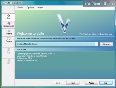 Опубликована новая версия программы для создания загрузочного диска с ОС Windows Vista. С помощью vLite 1.1 RC можно удалять ненужные компоненты, интегрировать драйвера, изменять стандартные значения реестра, применяя свои настройки, а также автоматизировать процесс установки системы Windows Vista. После внесения всех изменений в дистрибутив Windows Vista vLite 1.1 RC может создать из него загрузочный ISO образ, который полностью готов к записи на диск. В этой версии vLite 1.1 RC добавлены новые функции (Disk Quota, Diva Server, IPsec Policy Agent, Jet Database Engine, Network and Sharing Center, Network List Service, Network Location Awareness, Table Driven Text Input Processor, Windows Picture and Fax Viewer), появилась поддержка WLAN, появилась возможность отображения скрытых компонентов ОС, исправлены ошибки. ОС: Windows XP/Vista | Многоязычный интерфейс | Бесплатно.