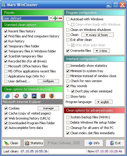 WinCleaner - Утилита для очистки системы от ненужных файлов. Умеет очищать истории открытых документов, поиска файлов, компьютеров и запуска программ; каталог временных файлов и временные файлы в каталоге Windows (*.tmp;*.bak), корзины (для всех дисков) и журналы выполнения приложений, а также удалять любые другие задаваемые пользователем файлы и ключи реестра. Кроме этого, WinCleaner позволяет удалять данные, относящиеся к веб-серфингу: кэш (копии посещённых страничек), файлы настроек Cookies, защищённые файлы 'index.dat', каталог 'Downloaded Program Files', историю посещённых адресов (URL), а также данные для автозаполнения форм. Из не сразу заметных, но полезных возможностей - умение автоматически загружаться вместе с Windows, чистить систему и выходить, допустимость перезаписи файлов до 20 раз (после этого уж точно никто не сможет восстановить удалённые данные), возможность автоматизации периодической очистки системы от нену
